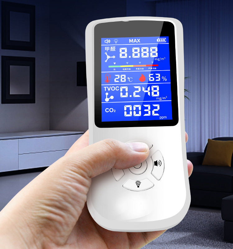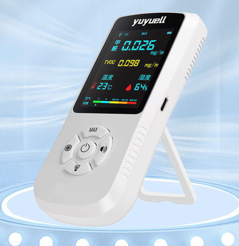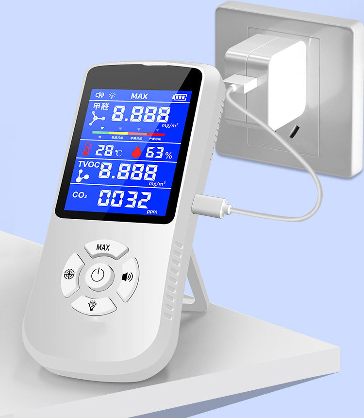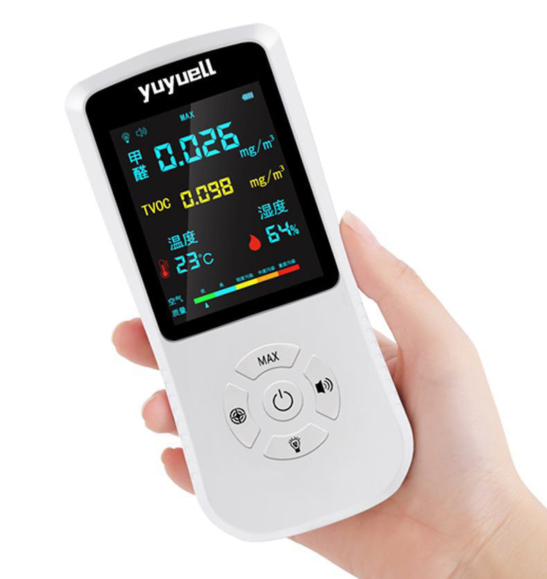 Questo monitor della qualità dell'aria indoor valuta con precisione più parametri della qualità dell'aria, inclusa la concentrazione di formaldeide (HCHO), i composti organici volatili totali (TVOC, composti organici volatili naturali e sintetici che causano la maggior parte degli odori) e le particelle fini di polvere (PM2.5, particelle con diametro <2,5 micron) che penetrano profondamente nel tratto respiratorio, raggiungono le alveoli polmonari e possono aggravare l'asma.