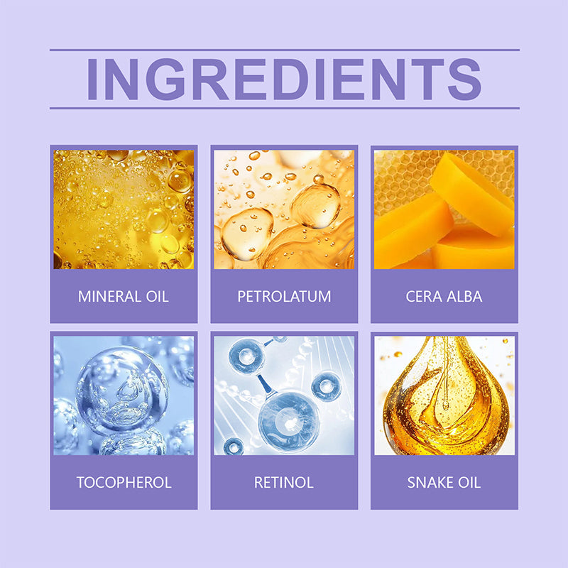 Principi attivi chiave: Olio minerale, Vaselina, Cera d'Api (Cera Alba), Tocoferolo (Vitamina E), Retinolo, Olio di serpente